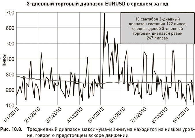 За период с января 2008 г. было только пять торговых дней с меньшим торговым диапазоном (и большинство из них вблизи какого-то важного праздника типа Рождества или Дня независимости 4 июля). Средний диапазон за год составил 247 пипсов. Как и узкий диапазон на дневном графике, бестрендовое движение последних трех дней также является предвестником тренда, лежащего впереди (см. рис. 10.8).