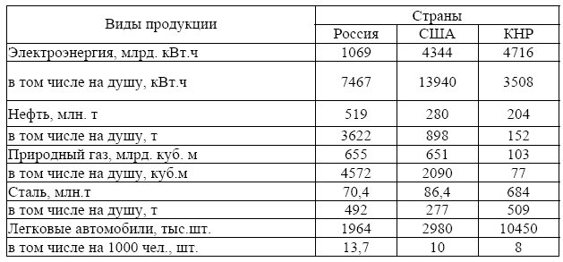Япония – 4668, Германия – 3613. Россия занимает первое место в мире по добыче нефти и производству сахарной свёклы, 2-е место по добыче газа (после США), третье по производству чугуна и картофеля, 4-е по производству электроэнергии и зерна, 5-е по вывозке древесины и производству мяса, 6-е по добыче угля, стали, цемента, 7-е по производству хлопчатобумажных тканей, 12-е по производству легковых автомобилей и лишь 14-е по производству бумаги. Россия существенно отстаёт в производстве электроэнергии, стали и автомобилей, но опережает в добыче нефти и газа (табл. 5.2):