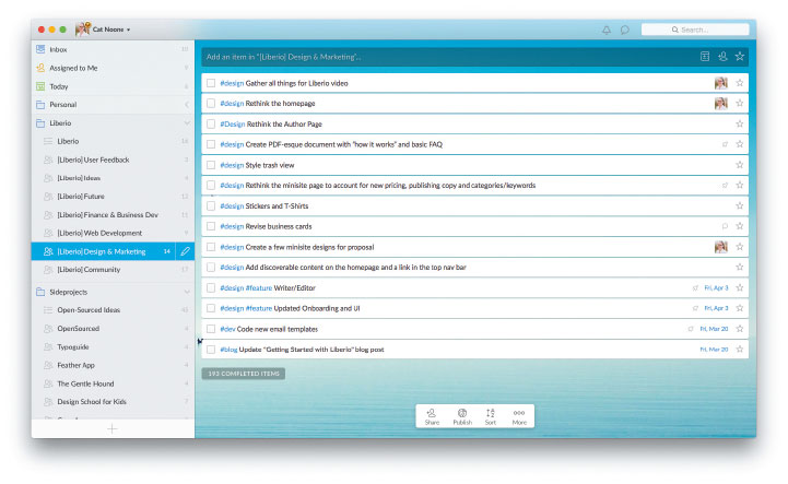 Мы убедились на собственном опыте, что зачастую чем проще процесс, тем лучше качество. Мы используем хештеги, которые обозначают, к какой задаче относится та или иная запись, к какой папке она принадлежит, кто ответственен за задачу. Wunderlist отлично подходит для этого, так как неважно, сколько человек участвует в проекте, — всегда должен быть кто-то один, кто видит процесс целиком, от начала разработки до запуска.