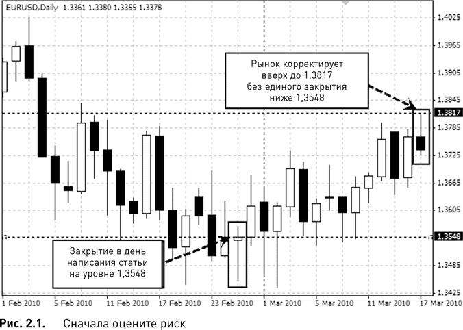 В статье, опубликованной 26 февраля 2010 г. в Wall Street Journal под заголовком «Хедж-фонды пытаются вести „профессиональную торговлю“ против евро», говорилось о том, что EURUSD опустится с отметки 1,3500 и достигнет паритета с долларом США (т. е. 1,0000). Такие вот статьи являются образчиками материалов, которые розничным трейдерам следует просто игнорировать.