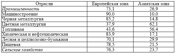 Как видно из таблицы, в европейской зоне преобладает перерабатывающая промышленность: машиностроение (90 %) и др. В тоже время велика доля чёрной металлургии – 85 %, химической и нефтехимической промышленности – 84 % и даже лесной и целлюлозно-бумажной – 70 %.