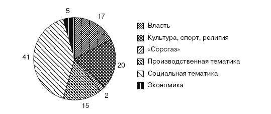 Попытка решить проблему нехватки поводов приводит также к большому количеству в эфире (20 %) сюжетов производственной тематики (см. рис. 1.24), по сути, не содержащих информационных поводов и сводящихся к констатации существования того или иного подразделения (например, сюжет о «наличии бригады по ремонту скважин») либо того или иного аспекта производственной политики (например, репортаж о том, что «у местных энергосетей есть своя политика по привлечению молодежи»). Такие сюжеты не содержат информационных поводов по определению. Далеко не все события на производстве являются городскими. Кроме того, производственная тематика должна отражаться в рамках специализированных тематических программ («От Малиновки до Зюзино»). Зачастую очевидным приоритетом становится материал о «Сорсгазе», даже если в городе наличествует иной, более значимый информационный повод.