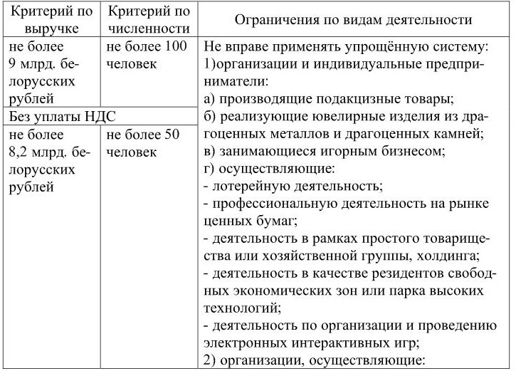 Таблица 7. – Критерии применения упрощенной системы налогообложения в Республике Беларусь в 2013 г.
