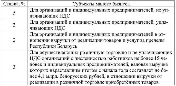 Налоговые стимулы наравне с либерализацией институциональных условий функционирования малого бизнеса являются одним из приоритетов в использовании мер государственного воздействия на экономику. Опыт реализации различных моделей налогообложения малого бизнеса в Республике Беларусь включает использование практически всех разработанных мировой теорией и практикой способов. В частности, Республика Беларусь имела опыт применения пониженной ставки для малых предприятий, которые имели различные критерии численности в зависимости от отрасли производства. Отраслевые критерии опирались на национальные особенности бизнеса. Проводимая реформа по упрощению налоговой среды функционирования малого бизнеса, необходимость гармонизации налогового законодательства республики с законодательствами иностранных государств, давление на правительство со стороны бизнес-сообщества являются краеугольными камнями в создании в настоящее время упрощенной системы налогообложения, вполне конкурентной и позволяющей отдельным субъектам обеспечивать рентабельность, превышающую среднюю по стране.