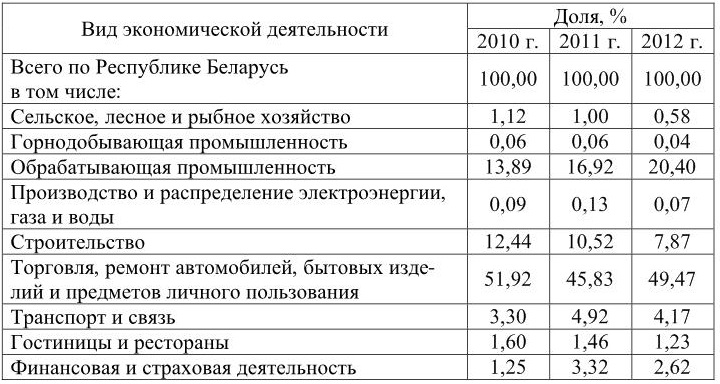 В целом по Республике Беларусь в 2010-2012 гг. установилось соотношение между организациями и индивидуальными предпринимателями, применяющими упрощенную систему налогообложения, приблизительно 40 к 60 %, однако оно меняется в зависимости от видов экономической деятельности. Подобная пропорция обеспечивается за счет превышения числа индивидуальных предпринимателей в таких значительных по численности видах деятельности, как торговля; ремонт автомобилей, бытовых изделий и предметов личного пользования; транспорт и связь; операции с недвижимым имуществом, аренда и предоставление услуг потребителям; профессиональная, научная и техническая деятельность.