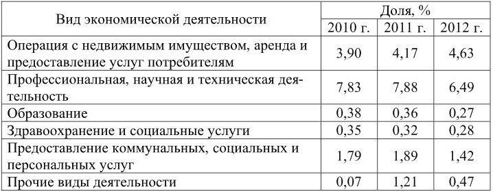 На протяжении 2010 – 2012 гг. наиболее существенные изменения произошли в уменьшении доли в торговле, увеличении субъектов, занятых профессиональной, научной и технической деятельностью, операциях с недвижимостью, строительстве и др.