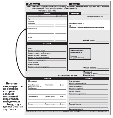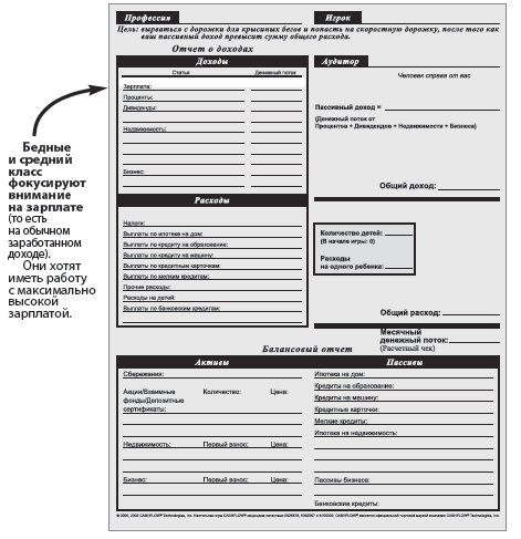 Еще важнее то, что данная игра научит вас понимать финансовый отчет. Читая книги или сыграв в «Денежный поток» всего пару раз, вы этих знаний не получите. Как известно, главным способом усвоения и закрепления знаний является повторение, поэтому, регулярно играя в «Денежный поток», участники смогут постичь технические нюансы финансового отчета, который становится показателем вашей успеваемости после того, как вы заканчиваете школу. Многократное практическое использование принципов работы финансового отчета помогает игрокам в полной мере осознать важность пассивного и портфельного доходов – доходов богатых людей.