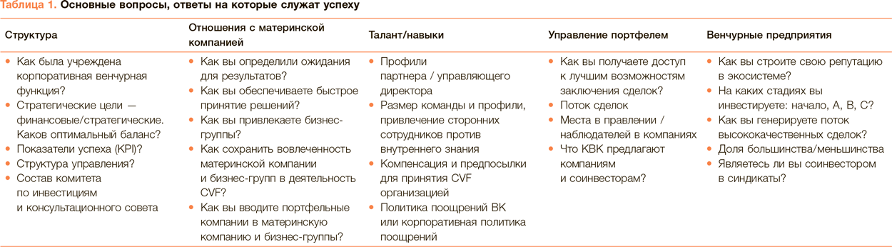 Сотрудничество и планирование инноваций и инвестирования жизненно важны. Структура, отношение к материнской компании предприятию, опыт/навыки, подход к управлению портфелем и венчурная философия – важнейшие области для оценки. Решение проблем каждого элемента необходимо, и необходимы ответы на основные вопросы. Это показано в таблице 1.
