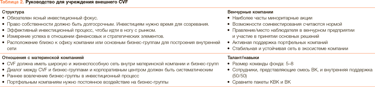 Более того, роль функции КВК должна действовать как ВК для поддержки инновационной стратегии. Многие утверждают, что такие инструменты, как CVF, могут быть успешны, если находятся за пределами организации под управлением инвестиционного комитета. В этой модели должен достигаться баланс. Мнений много, но решать руководству. Некоторые соображения по учреждению внешнего CVF (при поддержке материнской корпорации) даны в таблице 2.