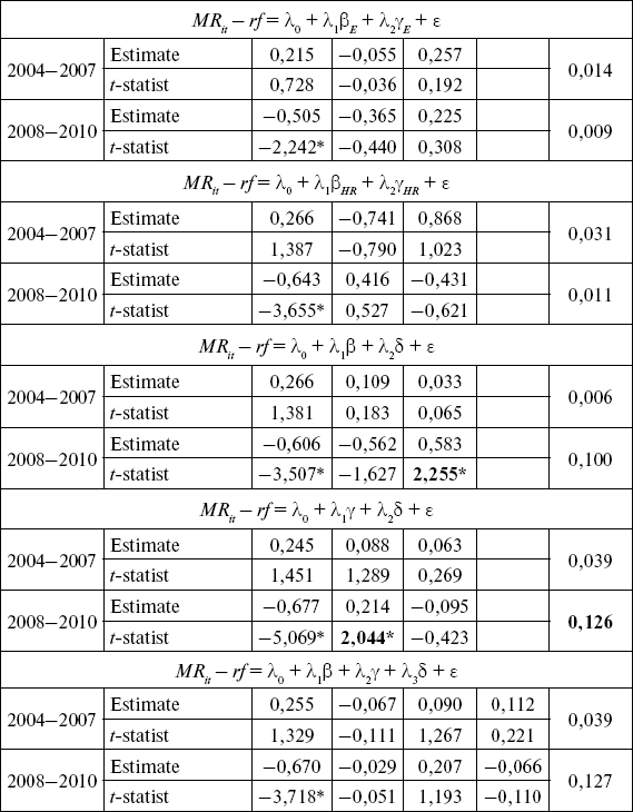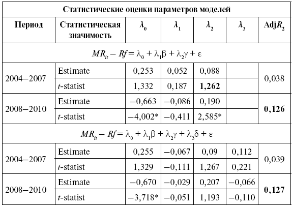 Систематическая асимметрия статистически значима на 5 %-м уровне в однофакторных и двухфакторных моделях, объяснительная способность модели улучшается с введением гамма-коэффициента по сравнению с другими моделями (В2 = 0,123 в однофакторных моделях и R2 = 0,126 в двух факторных моделях). Лучшие результаты в объяснении различий доходности по активам наблюдаются на отрезке финансовой нестабильности (2008–2010).
