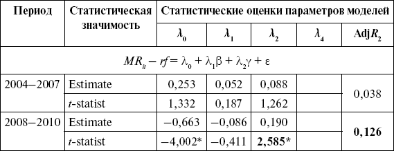 Кросс-секционный анализ четырехфакторной модели САРМ показал (см. табл. 9.24), что такие параметры систематического риска, как бета, гамма и дельта, статистически не значимы, только свободный член статистически значим на 5 %-м уровне. Более того, объяснительная способность четырехмоментной модели на отрезке с 2004 по 2007 г. гораздо ниже по сравнению с качеством традиционной рыночной модели (Adji?2= 0,076). Для отрезка финансовой нестабильности качество четырехмоментной модели улучшается по сравнению со стандартной версией САРМ, но данный положительный результат не свидетельствует в пользу выбора данной спецификации модели. Данное улучшение качества модели во многом обязано высокой объясняющей способности систематической асимметрии, тем не менее все переменные в модели, включая ко-асимметрию, статистически не значимы.