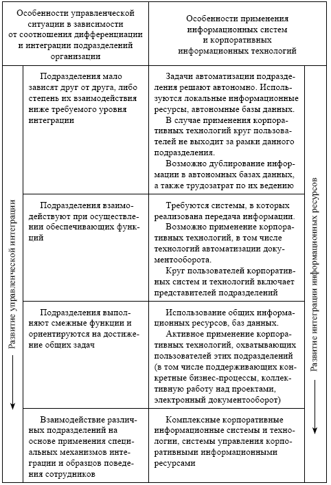 Иллюстрацией развития информационных технологий в соответствии с задачами управленческой интеграции является табл. 11, в которой приведены четыре типовые управленческие ситуации. Интеграционный эффект на уровне организации проявляется при использовании различных корпоративных информационных систем и технологий (не только систем электронного документооборота, но также и ERP-систем, информационных порталов и интранет-технологий, совместной работы над проектами и др.), соответствующих ситуациям второго, третьего и четвертого типа. Корпоративные информационные технологии позволяют решать задачи управленческой интеграции в наиболее сложной ситуации, когда требуется обеспечить взаимодействие подразделений, отличающихся высокой степенью дифференциации. Например, к такому уровню сложности относятся задачи управленческой интеграции в банковских структурах [72].