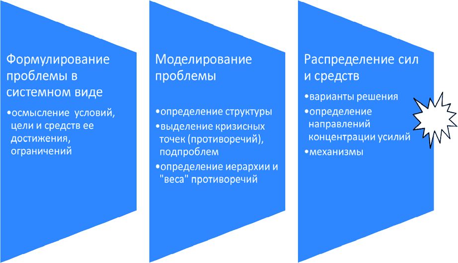 • создание механизмов (включая организационные аспекты и создание мотивационного поля) и алгоритмов решения проблемы;