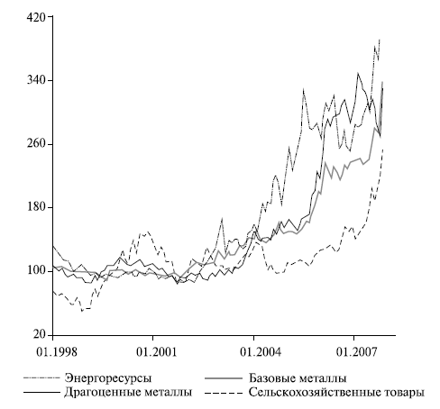 Тем не менее приходится признать, что только действием фундаментальных факторов рост товарных активов объяснить достаточно сложно. На мировом финансовом рынке усиливается корреляция между динамикой сырьевых активов и динамикой курса доллара. Во многом динамика сырьевого рынка стала зависеть от динамики валютного еще до кризиса, в 2004–2008 гг. На товарном рынке начал надуваться пузырь. Специалисты из Международного банка расчетов [Domanski, Heath, 2007] указывают на растущую корреляцию на рынке товарных активов. Причем из рис. 10.10, приведенного в их работе, видно, что все сырьевые активы с 1998 по 2007 г. выросли как минимум в 2 раза.