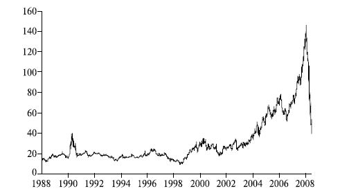 Но кроме фундаментальных предпосылок в росте спроса на сырьевые активы значительная доля приходится и на финансовую составляющую. В этом плане очень показателен рынок нефти. Никакими фундаментальными факторами невозможно объяснить скачок фьючерсов на нефть с 80 до 147 и последующее падение до 30 (рис. 10.11).