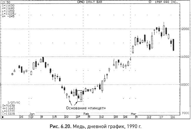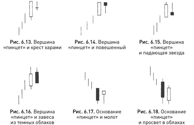 Модель «пинцет» состоит как минимум из двух свечей с одинаковыми максимумами либо минимумами и называется так потому, что входящие в нее свечи напоминают разведенные зубцы пинцета. Если эта модель формируется на растущем рынке и у свечей совпадают максимумы, то она называется вершиной «пинцет», если на падающем и у свечей совпадают минимумы – то основанием «пинцет». Пинцеты могут быть образованы телами свечей, тенями и/или свечами типа «дожи», расположенными рядом либо недалеко друг от друга. Обычно эти модели не являются долгосрочными сигналами разворота, но они приобретают важное значение, когда появляются после длительного тренда либо подтверждаются сигналами других возникающих при этом моделей (см. рис. 6.13–6.18).