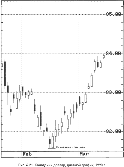 На рисунке 6.20 минимумы в районе $0,95, до которых рынок опускался 24 января, спустя неделю были протестированы снова, и при этом на графике сложилась бычья модель поглощения. На рисунке 6.21 аналогичную модель (и одновременно основание «пинцет») сформировали свечи от 14 и 15 февраля. В свою очередь, на рисунке 6.22 повешенный, появившийся вслед за длинной белой свечой, завершил формирование модели «харами», причем ценовые максимумы совпали не только у этих двух свечей, но и у идущей следом третьей свечи – все вместе они образовали вершину «пинцет».