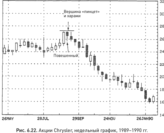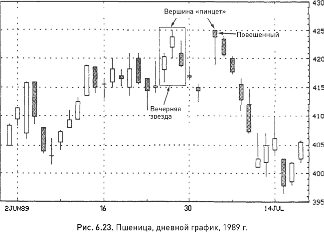 На рисунке 6.23 представлена разновидность вечерней звезды (у классического варианта этой модели первая белая свеча, напомню, должна быть длиннее). Ее центральная свеча задала новый уровень сопротивления, и на следующей неделе его подтвердило возникновение повешенного. Цена поднималась до максимумов вечерней звезды, но не смогла на них удержаться и пошла вниз, в результате чего на графике сложилась вершина «пинцет».