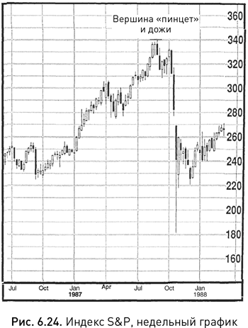Как можно видеть на рисунке 6.24, в августе 1987 г. индекс S&P достиг пиковых значений, на которых длинная белая свеча и идущая за ней свеча «дожи» образовали вершину «пинцет». На следующей неделе она успешно выступила в качестве уровня сопротивления. Появление дожи после длинной белой свечи в зоне высоких цен всегда является весьма опасным сигналом, о чем мы еще поговорим в главе 8.