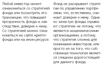 Также преимуществом является концентрация значительных объемов криптоактивов в руках профессионального управляющего. Например, если на рынке появляется явно перспективная валюта, криптофонд может выкупить большую часть монет на ранних этапах, тем самым обеспечивая большую доходность.