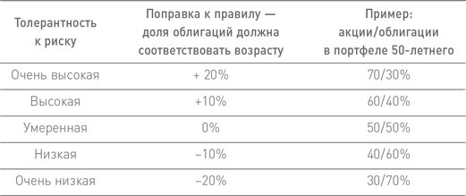 Широко известное правило требует, чтобы доля облигаций в портфеле соответствовала возрасту инвестора. Соотношение акций и облигаций в портфеле 20-летнего должно составлять 80 к 20, тогда как портфель 70-летнего должен включать 30 % акций и 70 % облигаций. С учетом своей толерантности к риску инвестор может изменить эти пропорции следующим образом: