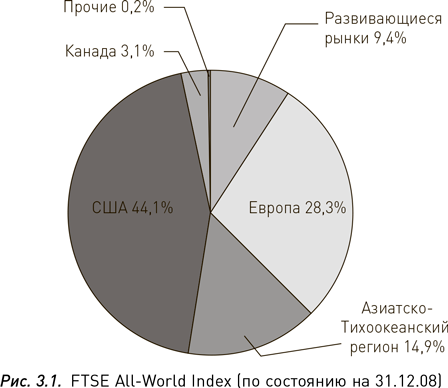 Когда решение о соотношении количества акций и облигаций принято, следующая важная задача – распределить средства между разными категориями акций. В грубом приближении этот процесс упрощает вера в эффективность рынка: нужно купить и держать полный комплект ведущих мировых акций. Именно эту функцию выполняет Всемирный индекс Financial Times (Financial Times Stock Exchange Index или FTSE, произносится «футси»), который рассчитывает агентство, совместное предприятие газеты и Лондонской фондовой биржи. Рис. 3.1 иллюстрирует его состав на 31 декабря 2008 г.