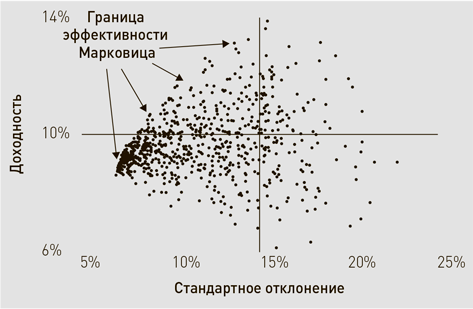Прежде всего обратите внимание на вертикальную линию, соответствующую стандартному отклонению 15 %. Заметьте, что многие портфели лежат на ней или рядом с ней – понятно, что инвестору хочется иметь портфель, который максимально приближен к этой линии в ее верхней части, это позволит получать самую высокую доходность при данном уровне риска. Аналогичным образом, если портфель лежит на или вблизи горизонтальной линии, соответствующей доходности 10 %, очевидно, что инвестор предпочтет оказаться как можно правее, чтобы получать такую доходность при минимальном уровне риска.