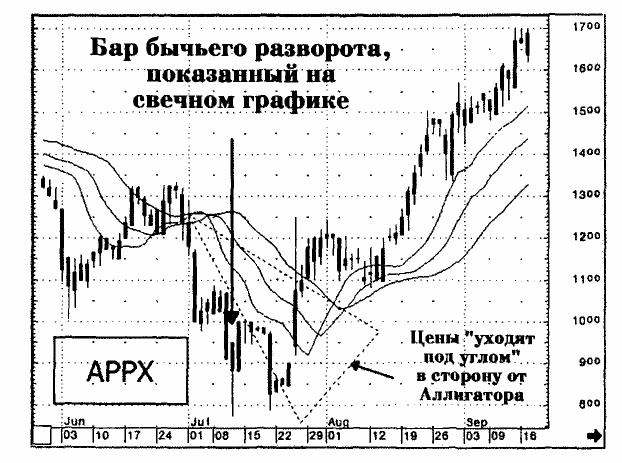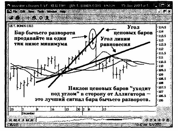 Ранее мы упомянули, что бар бычьего/медвежьего разворота должен двигаться в сторону от Аллигатора. Мы предлагаем, чтобы вы представили себе некую резиновую ленту вокруг голубой линии (челюсти Аллигатора) и текущей цены. Когда цена движется под более крутым углом, чем Аллигатор, видно, что воображаемая резиновая лента растягивается все больше и больше, отдавая больше силы, когда он решает развернуть текущее движение цены. Мы называем эту формацию ангуляцией (angulation), имея в виду, что если вы прочертите одну линию вдоль пути следования Аллигатора, а другую линию вдоль пути следования цен, то получится открывающийся угол. Эта формация проиллюстрирована на Рисунке 9-3, где облигации в бычьей ангуляции дают сигнал медвежьего бара разворота.