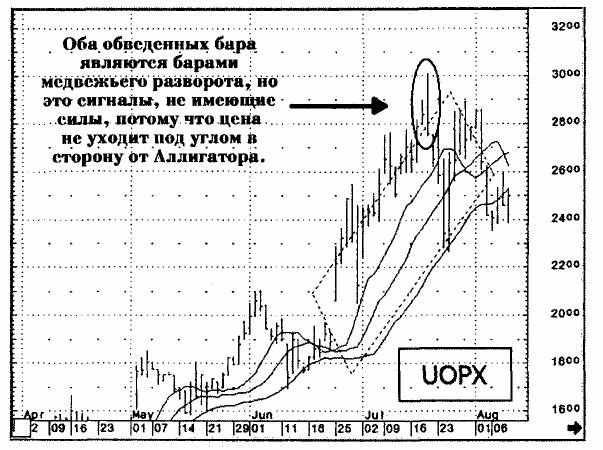 Рассмотрите дневной график UOPX Apollo Group Stock на Рисунке 9-5. Этот дневной график UOPX показывает, что цены движутся вверх под сходным углом (а не уходят под углом в сторону) относительно Аллигатора. Следовательно, бар медвежьего разворота, обведенный кружочком, не является имеющим силу сигналом.