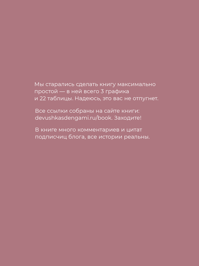 Когда я получила предложение написать книгу по мотивам моего блога, то была польщена (а кто бы не был), но и немного растеряна. Что нового я могу сказать после Кийосаки, Шефера и Баффетта? У меня нет ни уникальной системы бюджета, ни секретной стратегии инвестирования. Собственные успехи скорее выражаются в чувстве уверенности и осознанности, чем в конкретных процентах на счете. Да и в блоге я рассказываю достаточно известные вещи – ну кого я могу удивить?