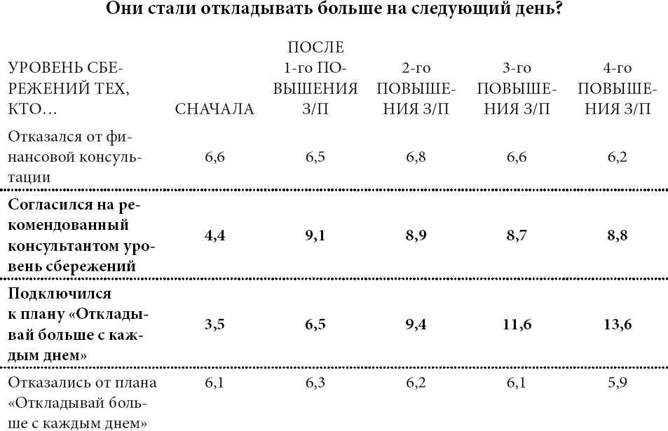 Бенарци и Тарбокс разработали более приемлемый вариант. Вместо того чтобы сообщать рекомендуемый уровень сбережений, вычисляемый программным обеспечением, Брайан должен был предложить сотрудникам увеличить уровень сбережений на 5 %. Если они не хотели на это идти, тогда он предлагал им версию «Откладывай больше с каждым днем».