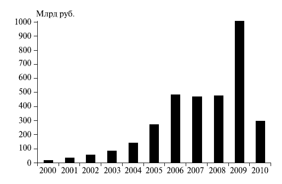 Рис. 1.3. Объем размещений новых выпусков корпоративных облигаций на российском финансовом рынке, млрд руб.