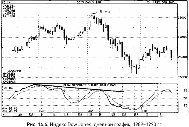 Взгляните на рисунок 14.4: дожи от 3 января, возникшая сразу за длинной белой свечой, должна была заставить быков призадуматься. В этот день цены превзошли декабрьские максимумы, но стохастический осциллятор не повторил их успеха, т. е. дивергенция была отрицательной, что служило важным подтверждением медвежьего сигнала дожи.