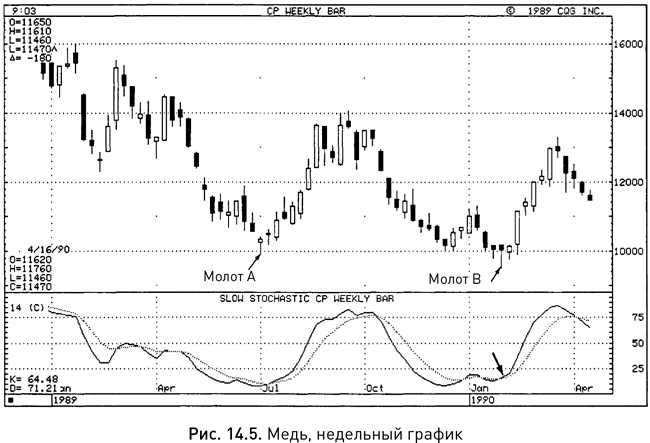 На рисунке 14.5 в середине 1989 г. цены на медь образовали основание в виде молота. В начале 1990 г. возникла новая серия молотов, но можно ли было считать их признаком еще одного основания? Безусловно, учитывая показания стохастического осциллятора. Молот В возник в районе новых минимумов, лежащих ниже минимальных отметок молота А, однако осциллятор при этом находился на более высокой отметке. Другими словами, наблюдалась положительная дивергенция, которая свидетельствовала об ослаблении давления продавцов.