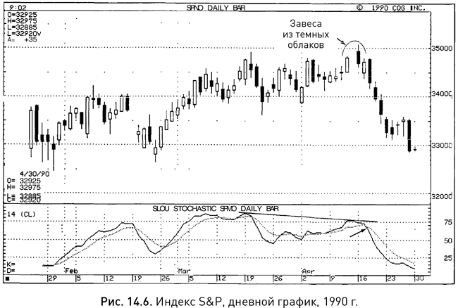 Как можно видеть на рисунке 14.6, свечи от 12 и 16 апреля образовали завесу из темных облаков. При формировании черной свечи от 16 апреля цены поднимались выше уровня мартовских максимумов, однако стохастик при этом не демонстрировал новых достижений. Завеса из темных облаков вместе с отрицательной дивергенцией сигнализировали о вероятном завершении ралли. А дополнительным подтверждением того, что цены пойдут вниз, стало отрицательное пересечение: быстрая кривая %К опустилась ниже медленной %D в точке, помеченной на графике стохастика стрелкой.