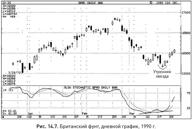 Так, на неделе с 19 марта 1990 г. на этом графике сформировалась разновидность утренней звезды, у которой белое тело третьей свечи не перекрывало значительную часть черного тела первой свечи, как в идеальном варианте этой модели. Чтобы решить, стоит ли уделять внимание сигналу несовершенной модели, следует обращаться к другим техническим индикаторам. В данном случае в момент возникновения утренней звезды (точнее, ее вариации) цены достигли новых локальных минимумов, однако на графике стохастического осциллятора этого не наблюдалось. Налицо была бычья положительная дивергенция, которую вскоре подтвердило пересечение линией %К снизу вверх линии %D. Соответственно, тот факт, что модель «утренняя звезда» выглядела несовершенной, всего лишь отсрочил окончательный вывод о том, что рынок достиг основания.