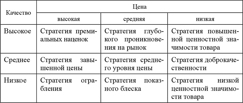 Таблица 12.3. Выбор стратегии установления цен в зависимости от качества и цены товара