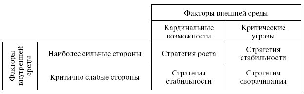 Анализ внутренней и внешней среды организации осуществляется методом SWOT-анализа, предполагающим выявление сильных и слабых сторон внутри организации (strengths, weaknesses) а также возможностей и угроз во внешней среде (opportunities and treats) (его описание приведено в разд. 3). После сбора эмпирических данных мы получаем набор критично слабых сторон, наиболее сильных сторон, кардинально значимых возможностей и критических угроз. Затем проводится так называемый корреляционный SWOT-анализ, в ходе которого критические факторы внешней среды сочетаются с факторами внутренней среды (см. рис. 4.1).