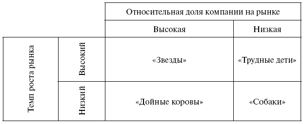 Оценка активов внутри холдинга (задача, которая реализуется в рамках разработки корпоративной стратегии) осуществляется одним из методов «портфельного анализа». Наиболее популярным его вариантом является матрица Бостонской консалтинговой группы (БКГ). Данная матрица представляет собой таблицу, в которой сопоставляются показатели, характеризующие стратегические позиции компании. Вертикальная ось матрицы отражает привлекательность отрасли с точки зрения темпов роста рынка, а горизонтальная – относительную долю компании на рынке по сравнению с основным конкурентом (компания располагается посередине, если ее доля равна доле главного конкурента, а дальше каждое последующее деление по оси Y определяет, во сколько раз эта доля больше/ меньше) (см. рис. 4.2).