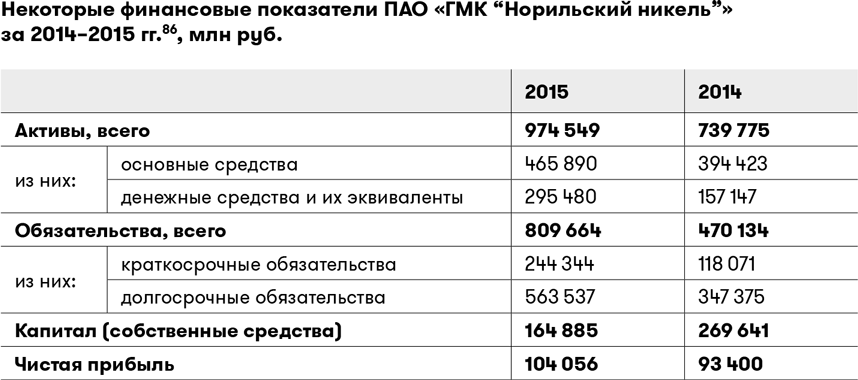 Мы видим, что по размеру капитала (собственных средств) ПАО «ГМК “Норильский никель”» не такая крупная компания, как, например, ПАО «Сбербанк России» или ПАО «Газпром». Бухгалтерский баланс компании положительный, то есть сумма активов превышает сумму обязательств. Сумма обязательств, по сравнению с суммой активов, довольно значительна, но особой тревоги не вызывает. Сумма краткосрочных обязательств (которые нужно погасить в течение следующего года) размером в 244 344 млн руб. уже перекрывается суммой имеющихся в кассе и на счетах предприятия денежных средств и их эквивалентов (295 480 млн руб.). Компания прибыльная: в 2015 г. ее чистая прибыль увеличилась на 11,4 % по сравнению с 2014 г. Этих цифр вполне достаточно, чтобы считать ПАО «ГМК “Норильский никель”» надежной и прибыльной компанией и без опаски приобретать ее акции.