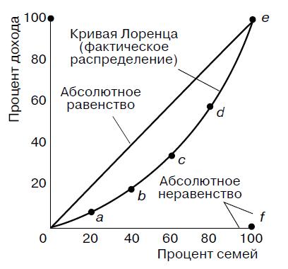 Одним из наиболее известных способов измерения этого неравенства является построение кривой Лоренца, названной так по имени американского экономиста и статистика Макса Лоренца. Речь идет о персональном, а не функциональном распределении доходов. Абсолютное неравенство означает, что и 20 %, и 40 %, и 60 %, и т. д. населения не получают никакого дохода, за исключением одного-единственного, последнего в ряду (линия 0f) человека, который присваивает 100 % всего дохода. Ломаная линия 0e – это линия абсолютного неравенства.