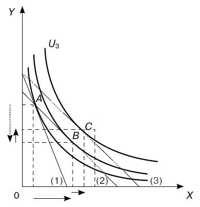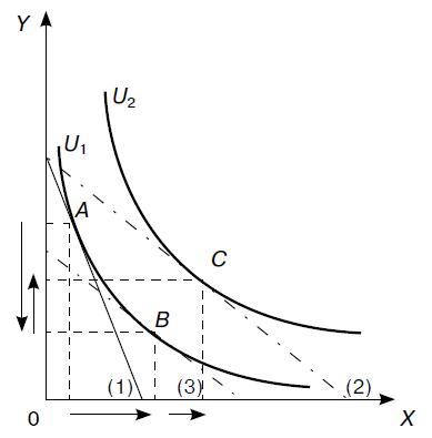 Линия бюджетного ограничения (1) соответствует первоначальным ценам благ и доходу покупателя. Потребительский выбор при ней находится в точке А и обеспечивает общую полезность U1. При снижении цены товара Х бюджетная линия примет вид (2), а рациональный выбор переместится в точку С на кривой безразличия U2. Эффекты замещения и дохода показаны с помощью фиктивной линии бюджетного ограничения (3), наклон которой соответствует новому соотношению цен, но реальный располагаемый доход позволяет достичь лишь прежнего уровня благосостояния U1 в точке В, т. е. остается неизменным.