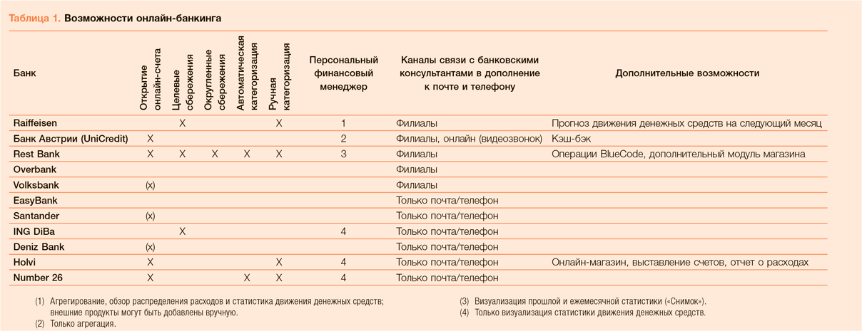 Лидером австрийского рынка инноваций в онлайн-банкинге является ERSTE Group, которая недавно запустила свой сервис онлайн-банкинга George и предлагает широчайший диапазон возможностей. Вдобавок банки экспериментируют с многоканальными услугами, такими как открытие счета по электронной почте и телефону или предоставление финансовых консультаций по видеосвязи (см. таблицу 1).
