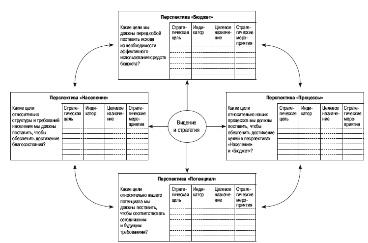 В выработке той или иной региональной политики проблемы целеполагания и их связь с ценностно-ориентированным подходом также заслуживают особого внимания, так как понятие цели и связанные с ним категории целесообразности, целенаправленности, ценности лежат в основе развития любой системы. Важнейшим стал переход от долгосрочного к среднесрочному плану на территории, где учтены финансовые условия. Для этого требуется прогноз доходов и расходов бюджета на среднесрочный период, оценка стоимости и распределения затрат по основным проектам развития. Но и этого недостаточно. Необходим еще один шаг: определение стратегических приоритетов. Это означает необходимость увязывать стратегические цели с планированием ресурсов (бюджетированием). Такие цели разрабатываются на основе имеющегося видения и стратегии и имеют статус решающих и ключевых. В корпоративной среде видение представляет собой краткий четко сформулированный внутренний документ, который определяет средне– и долгосрочные (от трех до десяти лет) цели организации, имеет внешнюю ориентацию, сфокусирован на рынок. Это видение образно и «доходчиво» дает ответы на вопрос: какой хочет видеть себя организация глазами окружающего мира? Поскольку система сбалансированных показателей призвана обеспечить преобразование видения и стратегии в пакет конкретных стратегических мероприятий, Р. Каплан и Д. Нортон ввели понятие «перевода стратегии в действия» (Translating Strategy to Action!)50. Имея краткое описание направлений самого высокого уровня (миссии, видения), можно приступить к решению задач развития, для чего потребуется разъяснение базовой стратегической ориентации и представление ее в измеримом виде. Чтобы спланировать и обеспечить процесс реализации целей, для каждой из них разрабатываются соответствующие финансовые и нефинансовые показатели, по которым, в свою очередь, определяются целевые и фактические значения. Их достижение возможно в ходе реализации стратегических мероприятий, по каждому из них определяются сроки, бюджет, устанавливается сфера и круг ответственности. Как правило, для городских подсистем используются четыре основные перспективы – «бюджет», «население», «внутренние процессы» и «потенциал»51. К достижению разработанных целей призвана реализация стратегических мероприятий. По каждому мероприятию определяются сроки его реализации, бюджет и четкая ответственность. На рис. 21 видно, что при разработке стратегических целей предлагается оперировать четырьмя основными перспективами – «бюджет», «население», «внутренние процессы» и «потенциал». Стратегические цели, измеряющие их индикаторы, целевые значения индикаторов и стратегические мероприятия взаимосвязаны. В сбалансированной системе показателей стратегические цели увязываются между собой причинно-следственной цепочкой в форме так называемых «стратегических карт» (Strategy Maps). Термином «стратегическая карта» Каплан и Нортон предложили называть причинно-следственные связи между отдельными элементами стратегии организации. После составления стратегической карты необходимо выбрать показатели для четкого и однозначного выражения стратегических целей, а также для определения степени достижения целей. С целью обеспечения однозначного понимания для каждой стратегической цели обычно испо