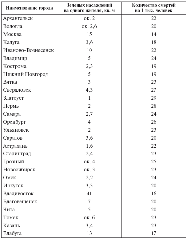 Революция обобществила зеленые насаждения. Однако в результате топливного кризиса в годы Гражданской войны многие деревья были вырублены. Так, в Саратове площадь лесных посадок к 1921–1922 гг. сократилась до 315 га. Меры по восстановлению зеленых насаждений были предприняты только в 1927–1928 гг.[504] Даже в столице площадь зеленых насаждений к 1931 г. увеличилась всего на 102 га. И это при том, что в годы нэпа вопрос о санитарно-оздоровительной роли городской зелени ставился как «вопрос о жизни для молодых и старых». К примеру, соотнесение данных о зеленых насаждениях по переписи 1926 г. и о смертности за 1927 г., по материалам Управления статистики Госплана РСФСР, свидетельствовало, что в городах с зеленой площадью свыше 10 кв. м на человека смертность резко падала[505] (табл. 5.4). Необходимый минимум зеленой площади для городов в то время составлял не менее 20 кв. м на человека[506].