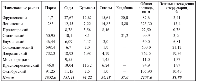 До революции в Москве многие зеленые насаждения принадлежали домовладельцам, купцам и прочим гражданам и потому были недоступны для общественного пользования. На 1 января 1916 г. в общественном пользовании находились всего три парка (Сокольническая роща, Воробьевы горы и Мамоновская дача) общей площадью 577,8 га, 36 садов и скверов (41 га) и 26 бульваров (41 га) – всего 659,8 га. Ежегодно высаживалось не более 5–6 тыс. деревьев и 20 тыс. кустарников. Но в ведении городской управы в 1913 г. находилось всего 6 тыс. деревьев. За 1906–1916 гг. в Москве было устроено всего 26 скверов и бульваров (9,3 га), причем только в центральной части города; на рабочих окраинах преобладали свалки[503].
