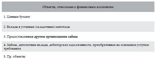 Смысл же последней позиции «пр. объекты» таков: если кроме бумаг государственных, муниципальных и «других организаций» существуют еще какие-нибудь ценные бумаги или дебиторские обязательства могут приобретаться не только на основании уступки требования, но другим образом, эти объекты также можно отнести к финансовым вложениям.