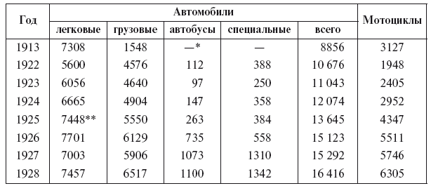 и 1110 – в 1928 г.[402] Скорее, можно доверять последним цифрам, так как они совпадают с данными Всесоюзной автомобильной переписи 1928 г., согласно которым в СССР в этом году было 16 426 автомобилей (одна машина на 9 тыс. жителей)[403]. Наибольшую плотность давал Крымский округ (одна машина на 39 кв. км площади), затем Закавказский (одна на 92), Московский (одна на 119) и Украинский (одна на 180). Наименьшие показатели демонстрировали: Сибирский округ (одна машина на 29 407 кв. км), Северный (одна на 16 079), Дальневосточный (одна на 14 940) и Казахский (одна на 11 942). Из зарегистрированных машин новых было всего 30,4 %. Если учитывать внутреннее деление автомобилей, то картина в 1913–1928 гг. менялась следующим образом (табл. 3.3)[404].