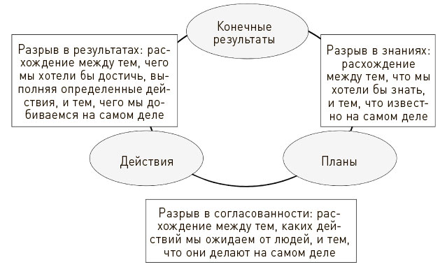 Определив глубинные причины, можно обозначить три разрыва терминами, которые будут более точно отображать причины их возникновения. Разрыв между конечными результатами и планами можно назвать разрывом в знаниях, разрыв между планами и действиями — разрывом в согласованности, а разрыв между действиями и их последствиями — разрывом в результатах. Таким образом, проблема в целом выглядит так, как показано на рис. 4.