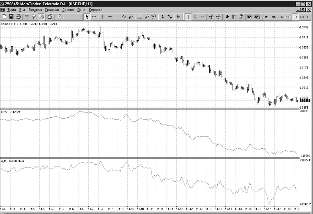 На рис. 80 приведен пример индикаторов OBV и A/D. Видно, что последний индикатор более чувствителен – его график более изломан, но очевидно, что принципиальных преимуществ это не даст.